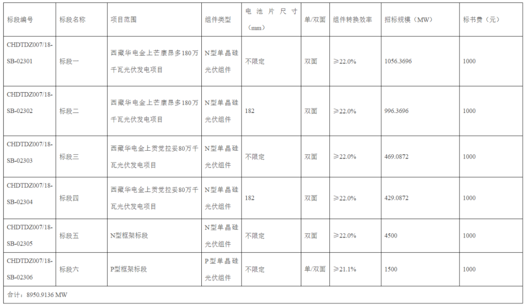 据悉,该项目于9月27日招标。其中,标段一至四:为西藏地区逇集中式光伏项目,招标容量2950.9136MW;供货期为2023年11月-2024年9月;标段五:为N型组件框架标段,招标容量暂定为4.5GW;标段六:为P型组件框架标段,招标容量暂定为1.5GW,框架有效期至2024年6月30日。