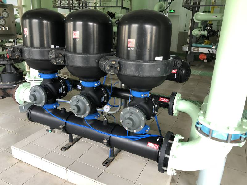集体反冲洗模式(GS):水由进水阀(气动碟阀或水力阀)进入进水总管分配到每个过滤单元过滤,过滤的水汇总到出水总管,并由出水阀流出。反冲洗时,进出水阀关闭,出水总管上的反冲洗进水阀打开,反冲洗水进入出水总管,反冲洗每个过滤单元汇总到进水总管并由进水总管上的排污阀流出,此时排污阀打开。反冲洗10-20秒后,反冲洗和排污阀关闭,进出水阀打开,系统重新回到过滤状态。该模式占地面积小,流量大,初始压降低,控制简单;不足之处是要求有大流量的反冲洗泵或压力水源,集体反冲模式多设计为4寸或6寸过滤单元的多个并联使用。